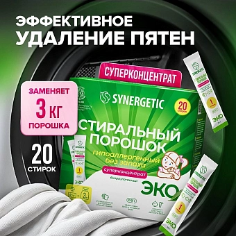 Часто к недостаткам порошков добавляют проблему дозировки — засыпать его в лоток стиральной машины приходится «на глаз». Исключить перерасход позволяют экосредства SYNERGETIC в виде прессованных стиков. Они рассчитаны на один стандартный цикл стирки и содержат 25 г суперконцентрата, который заменяет 150 г обычного порошка. Биоразлагаемый состав стиков не вредит микрофлоре септических установок и не содержит наполнителя сульфата натрия, поэтому не создает пыли — использовать его безопасно.