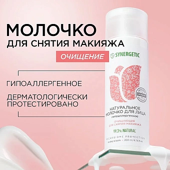 Гипоаллергенное молочко для снятия макияжа SYNERGETIC имеет легкую текстуру, которая при контакте с водой образует мягкую пену. В отличие от агрессивных средств, средство не оставляет чувства стянутости в Т-зоне после умывания.