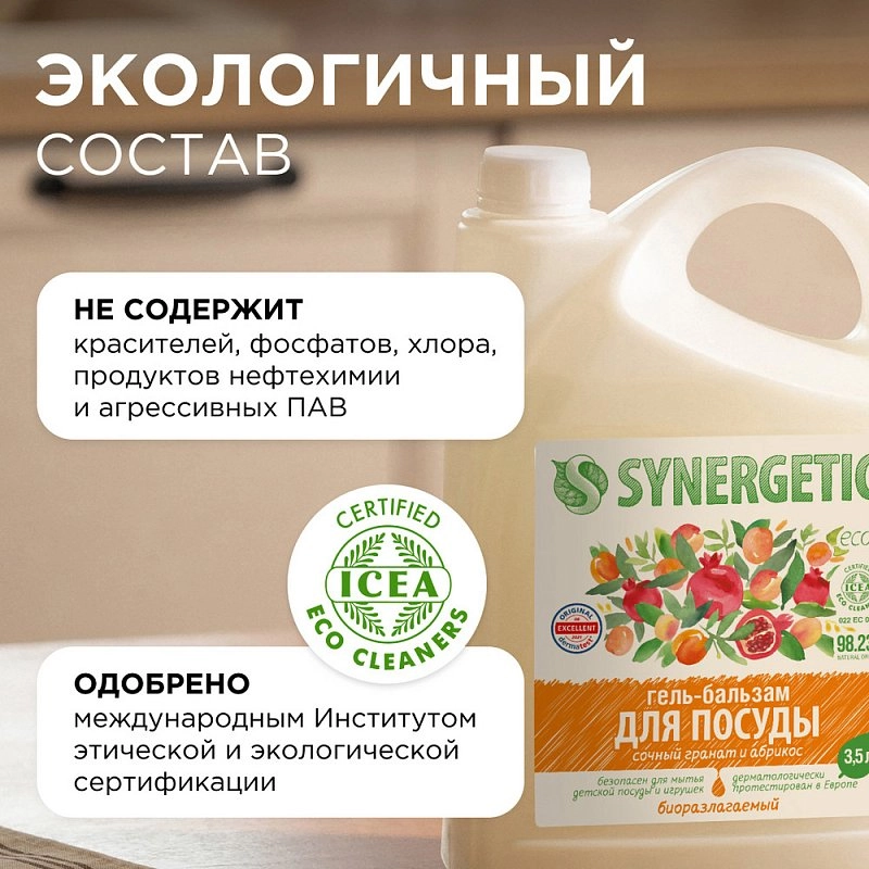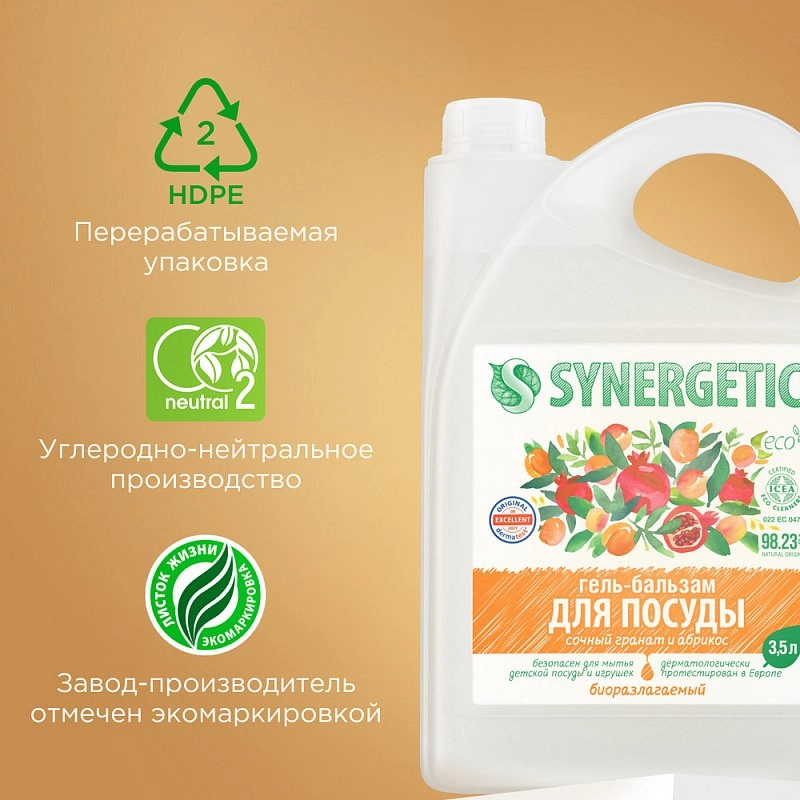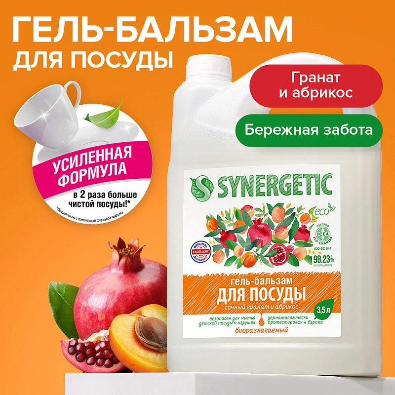 Формула геля-бальзама для посуды SYNERGETIC — это идеальный баланс эффективного моющего средства, пенообразования и бережного отношения к коже.