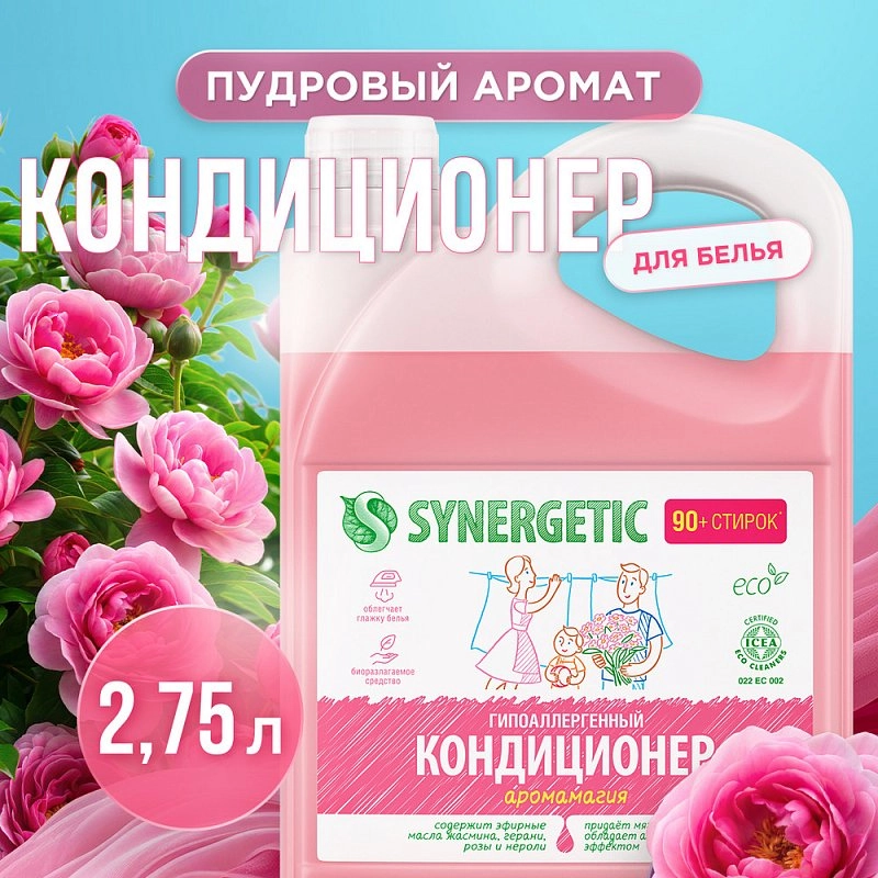 Сейчас объясним, к чему это мы. Средство для стирки обеспечивает чистоту, но именно кондиционер незаметно повышает качество жизни каждый день: смягчает ткань, придает аромат свежести, облегчает глажку и дает антистатический эффект. Вспомните ощетинившиеся махровые полотенца, которые стоят колом после высыхания — огрубевшая ткань хуже впитывает влагу и раздражает кожу. Кондиционер SYNERGETIC справляется со своей задачей даже в жесткой воде и заботится о вашем хорошем настроении каждый день.