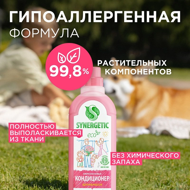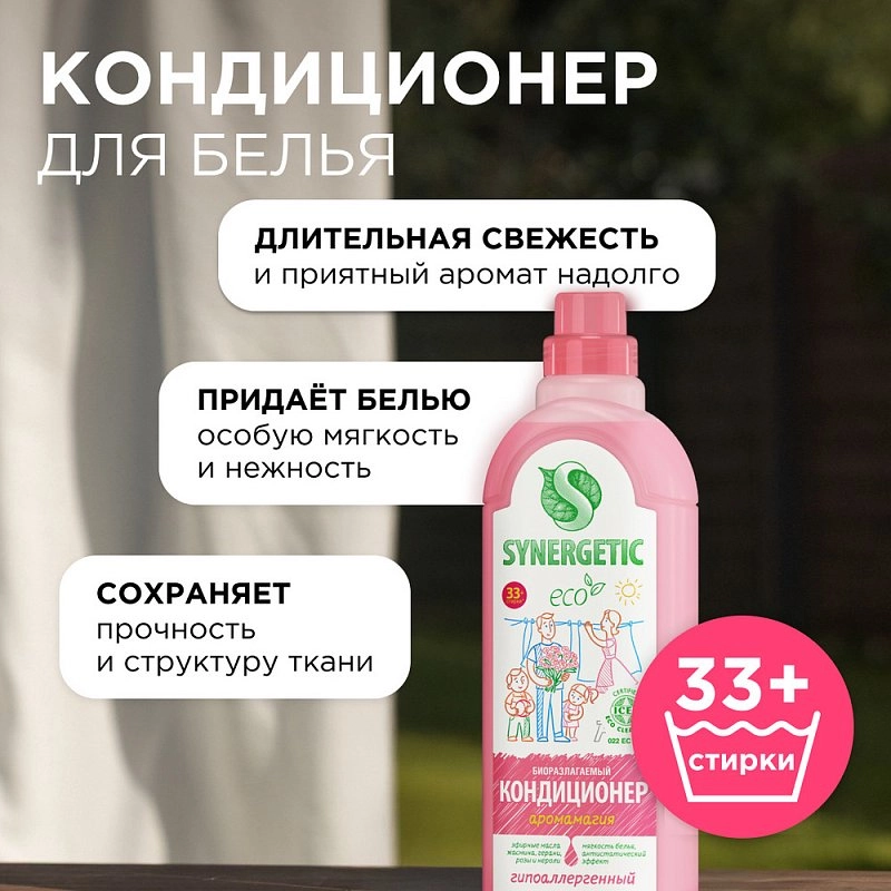 Сейчас объясним, к чему это мы. Средство для стирки обеспечивает чистоту, но именно кондиционер незаметно повышает качество жизни каждый день: смягчает ткань, придает аромат свежести, облегчает глажку и дает антистатический эффект. Вспомните ощетинившиеся махровые полотенца, которые стоят колом после высыхания — огрубевшая ткань хуже впитывает влагу и раздражает кожу. Кондиционер SYNERGETIC справляется со своей задачей даже в жесткой воде и заботится о вашем хорошем настроении каждый день.