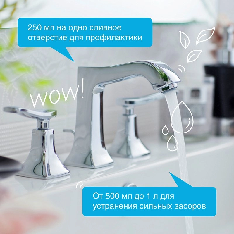При легком засоре: залейте 250-500 мл средства в сливное отверстие и оставьте на 10-20 минут.