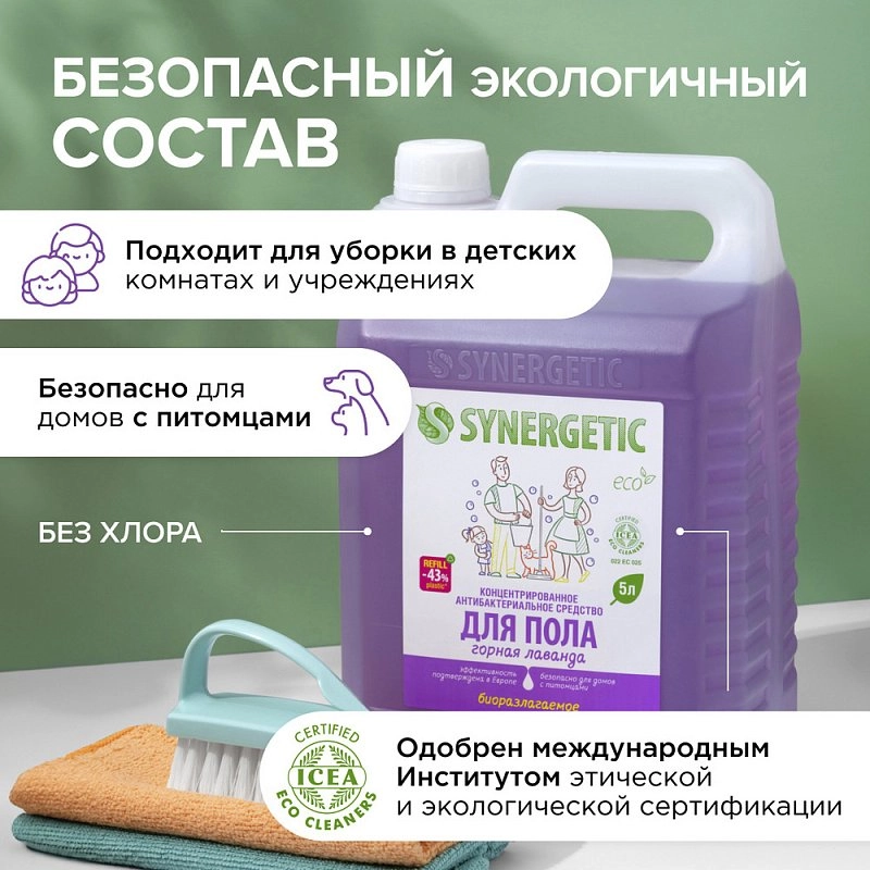 Биоразлагаемое концентрированное средство для мытья поверхностей SYNERGETIC «Горная лаванда» – универсальное средство для ежедневной и генеральной уборки пола и других поверхностей: столов, стен, потолка. Уникальный комплекс растительных тензидов эффективно удаляет загрязнения и неприятные запахи даже в холодной воде.