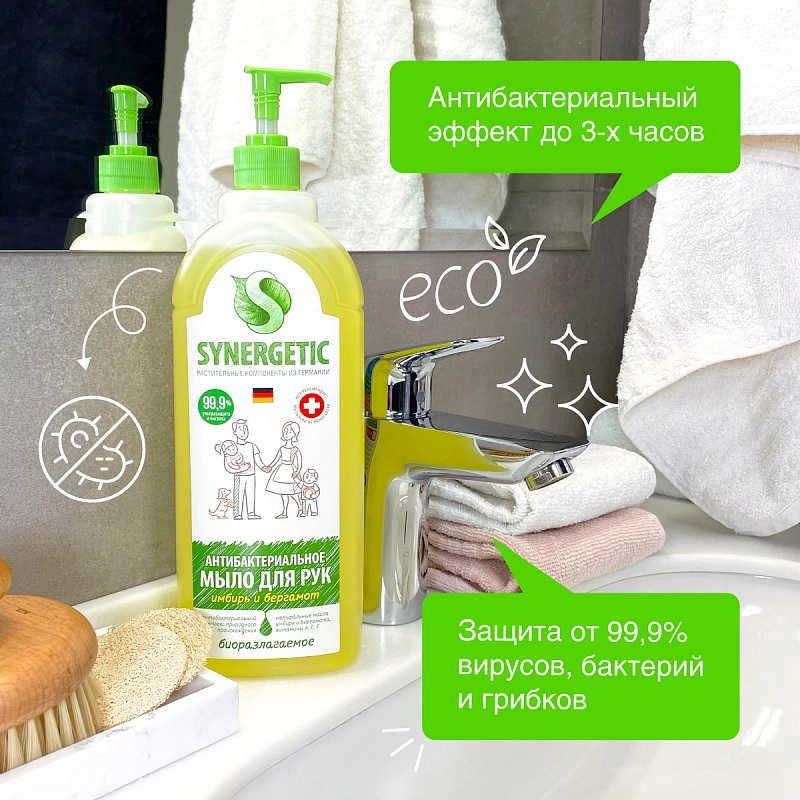 Мягкие растительные К-тензиды, морская соль и натуральные эфирные масла создают комплексный пролонгированный антибактериальный эффект.
